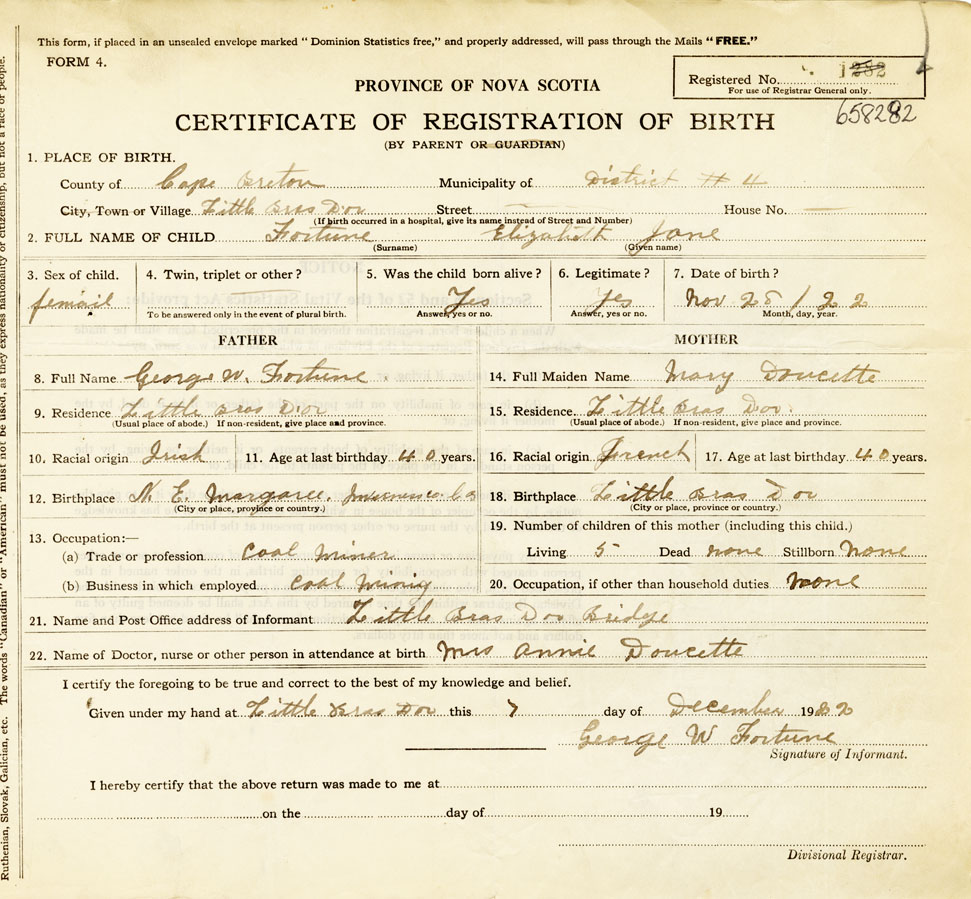 21. Name and Post Office address of Informant George W Fortune, Little Bras d'Or Bridge