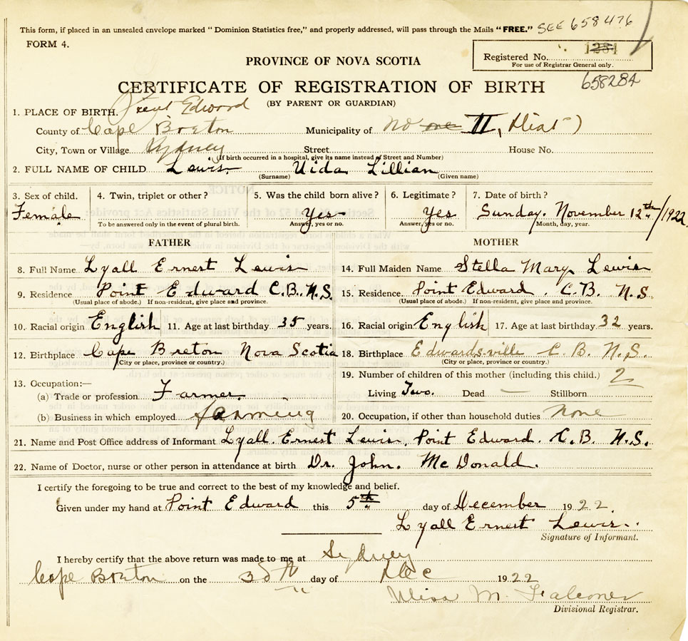 21. Name and Post Office address of Informant Lyall Ernest Lewis, Point Edward, CB