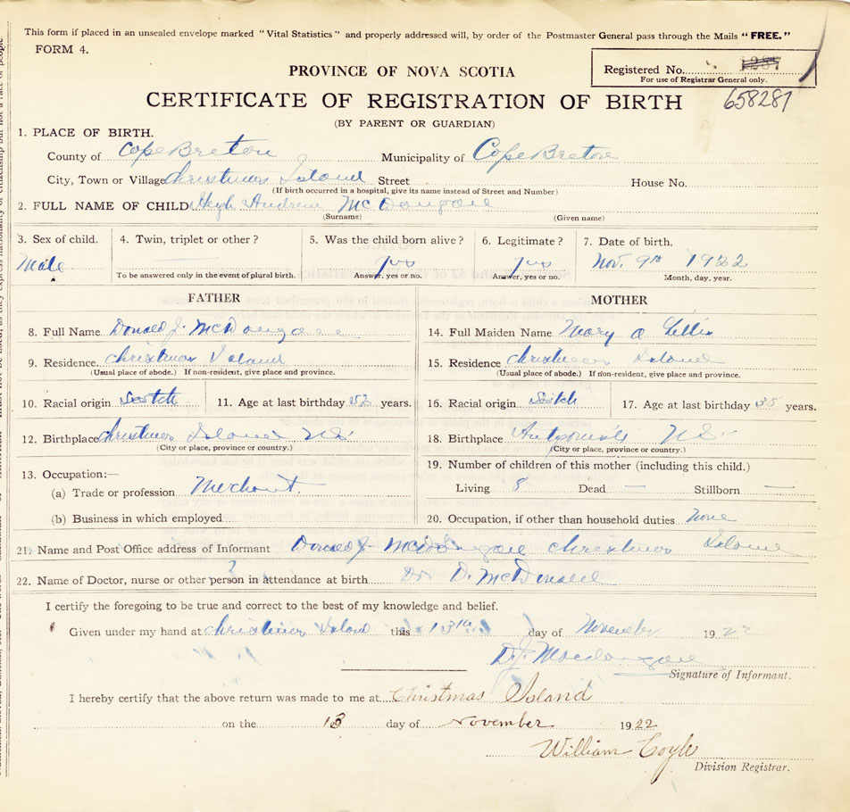22. Name of Doctor, nurse or other person in attendance at birth Dr. D. McDonald