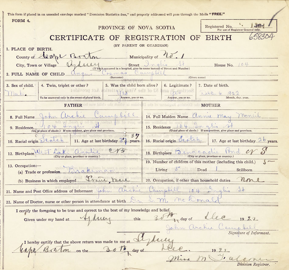 21. Name and Post Office address of Informant John Archie Campbell, 104 Inglis St.
