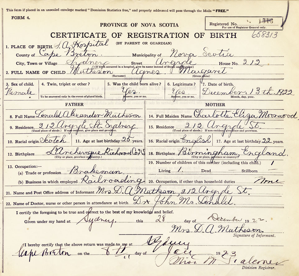 21. Name and Post Office address of Informant Mrs. D. A. Matheson 212 Argyle Street