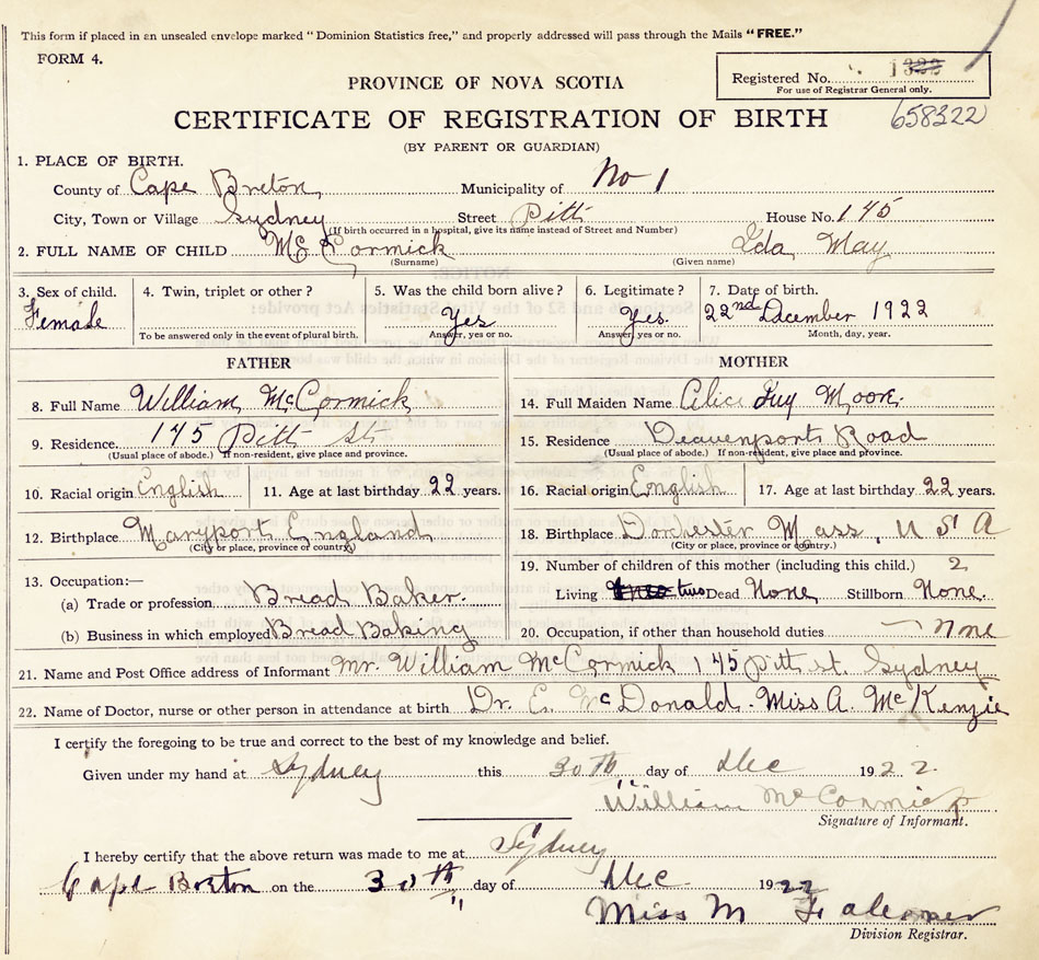 22. Name of Doctor, nurse or other person in attendance at birth Dr. E. McDonald, Miss A. McKenzie