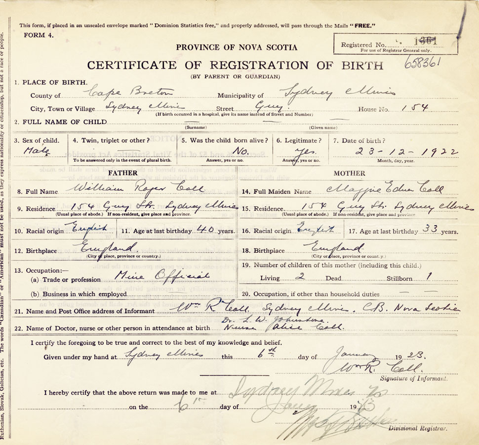21. Name and Post Office address of Informant Wm. R Coll, Sydney Mines, CB