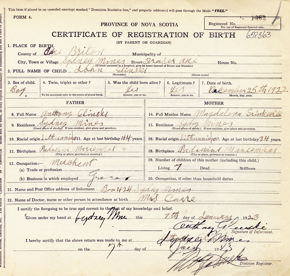 21. Name and Post Office address of Informant Anthony Glinski, Box 424, Sydney Mines