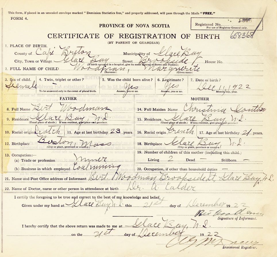 21. Name and Post Office address of Informant Bert Woodman, Brookside St., Glace Bay