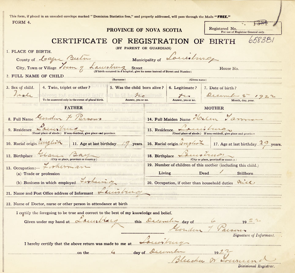 21. Name and Post Office address of Informant Gorden F Parsons Louisbourg