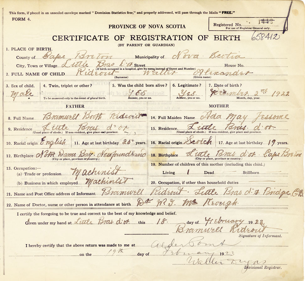 21. Name and Post Office address of Informant Bramwell Rideout Little Bras d'or Cape Breton