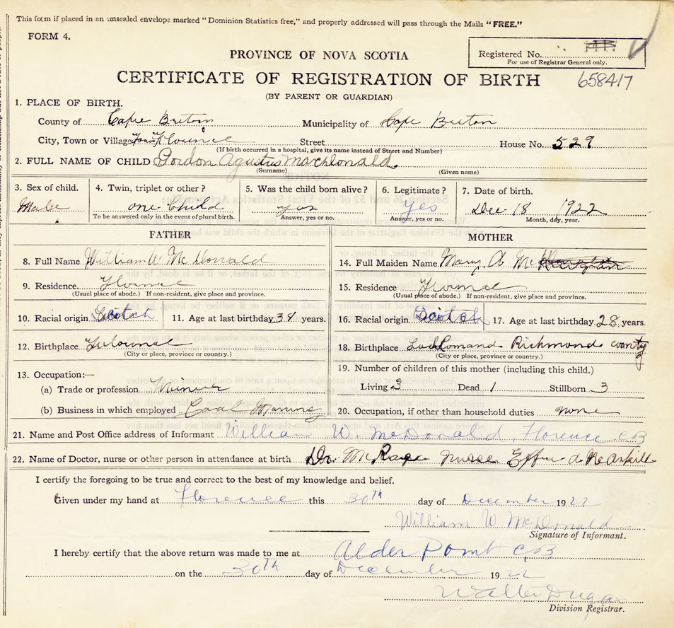 22. Name of Doctor, nurse or other person in attendance at birth Dr. McRae, Nurse Effie A McAskill
