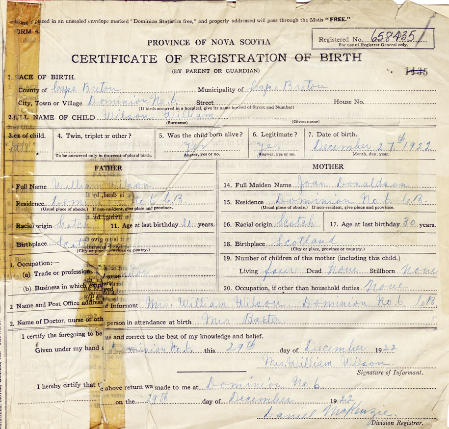 21. Name and Post Office address of Informant Mrs. William Wilson Dominion No. 6 Cape Breton