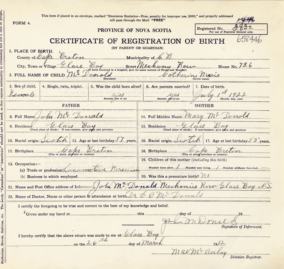 21. Name and Post Office address of Informant John McDonald Mechanics Row Glace Bay N.S.
