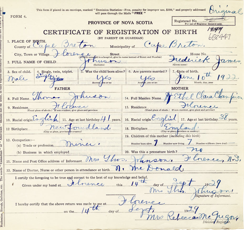 21. Name and Post Office address of Informant Mrs Thos. Johnson Florence, N.S