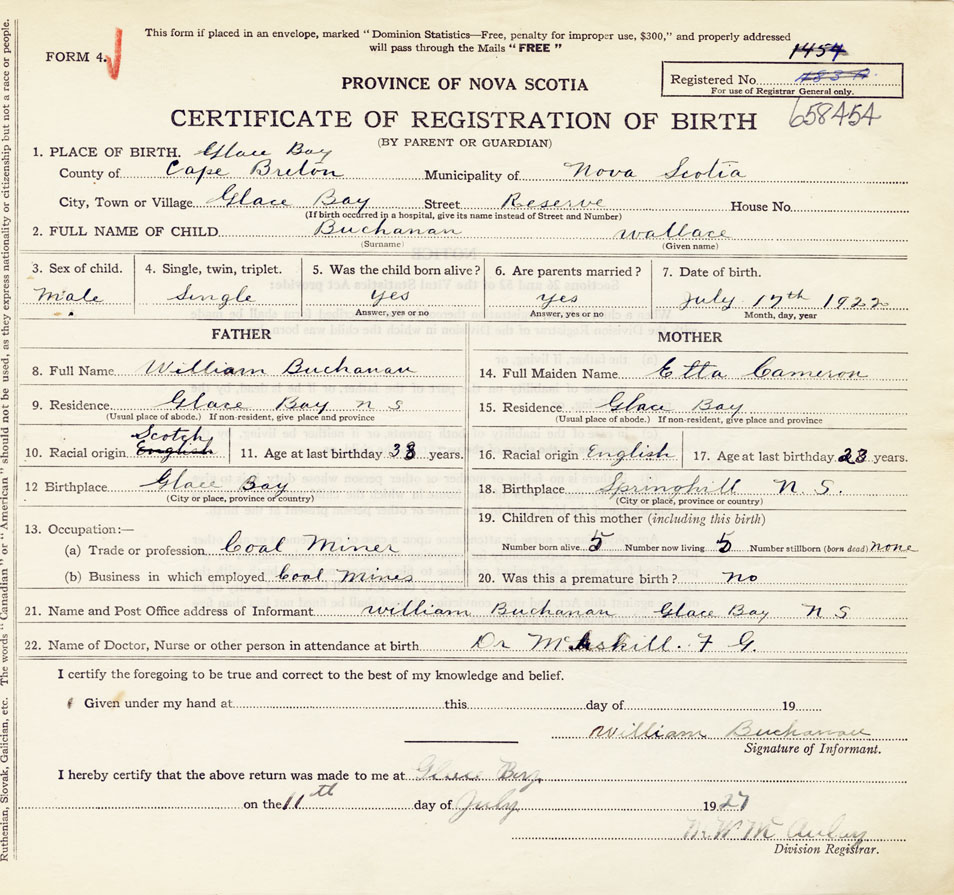 21. Name and Post Office address of Informant William Buchanan Glace Bay