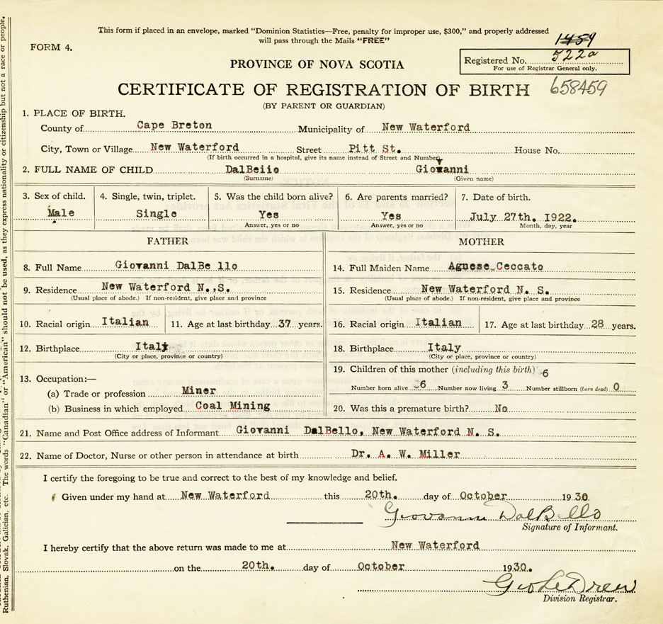 21. Name and Post Office address of Informant Giovanni DalBello, New Waterford
