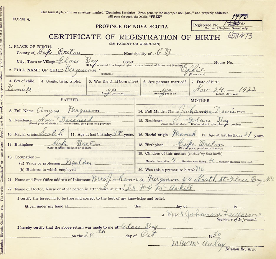 21. Name and Post Office address of Informant Mrs Johanna Ferguson, 55 North St., Glace Bay