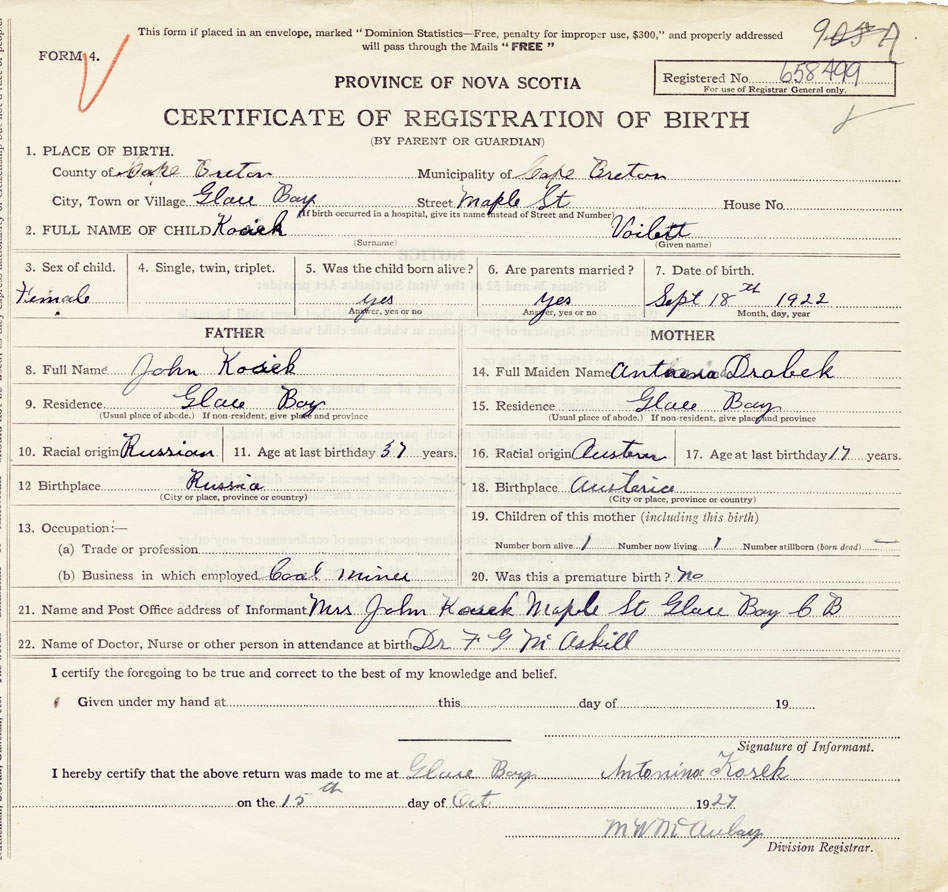 21. Name and Post Office address of Informant Mrs John (Antonina) Kosek, Maple St., Glace Bay, CB