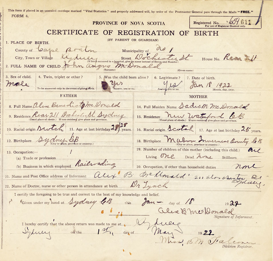 21. Name and Post Office address of Informant Alex B McDonald 211 Dorchester St., Sydney