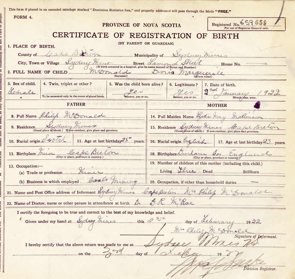 21. Name and Post Office address of Informant Mrs Philip McDonald, Sydney Mines, Cape Breton