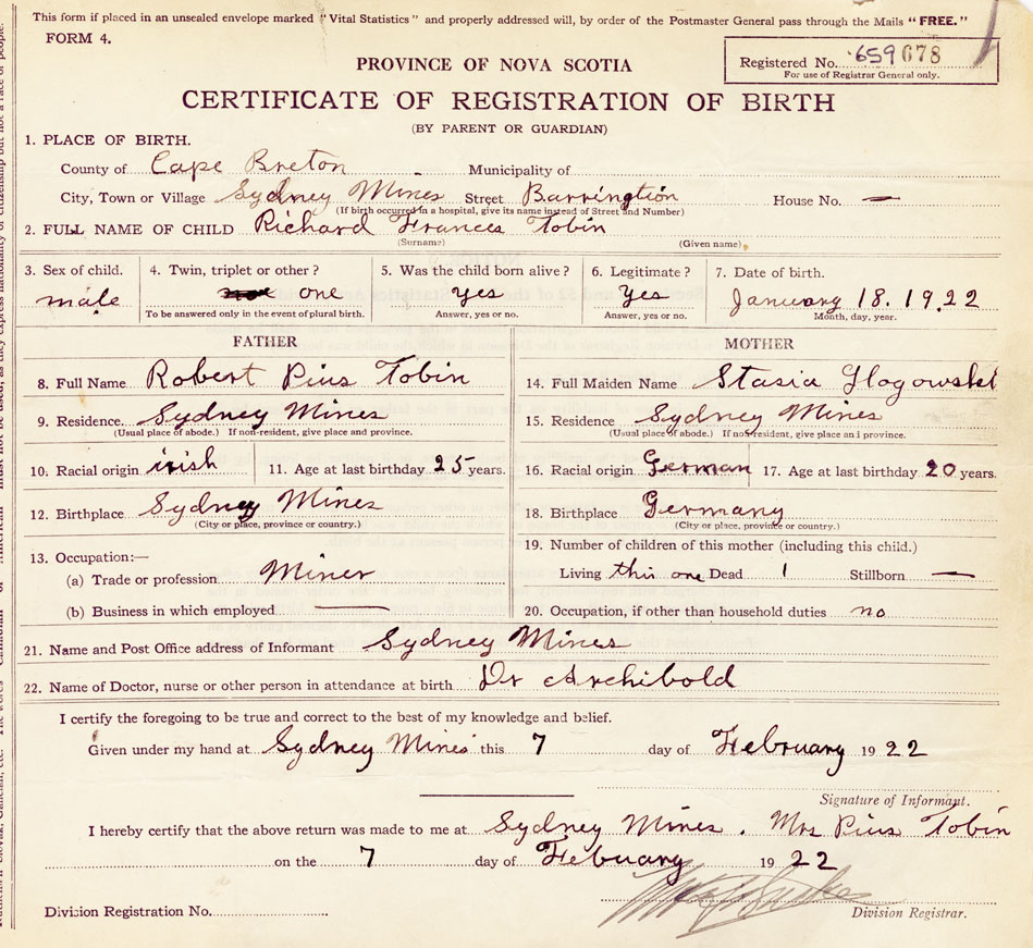 21. Name and Post Office address of Informant Mrs Pius Tobin Sydney Mines
