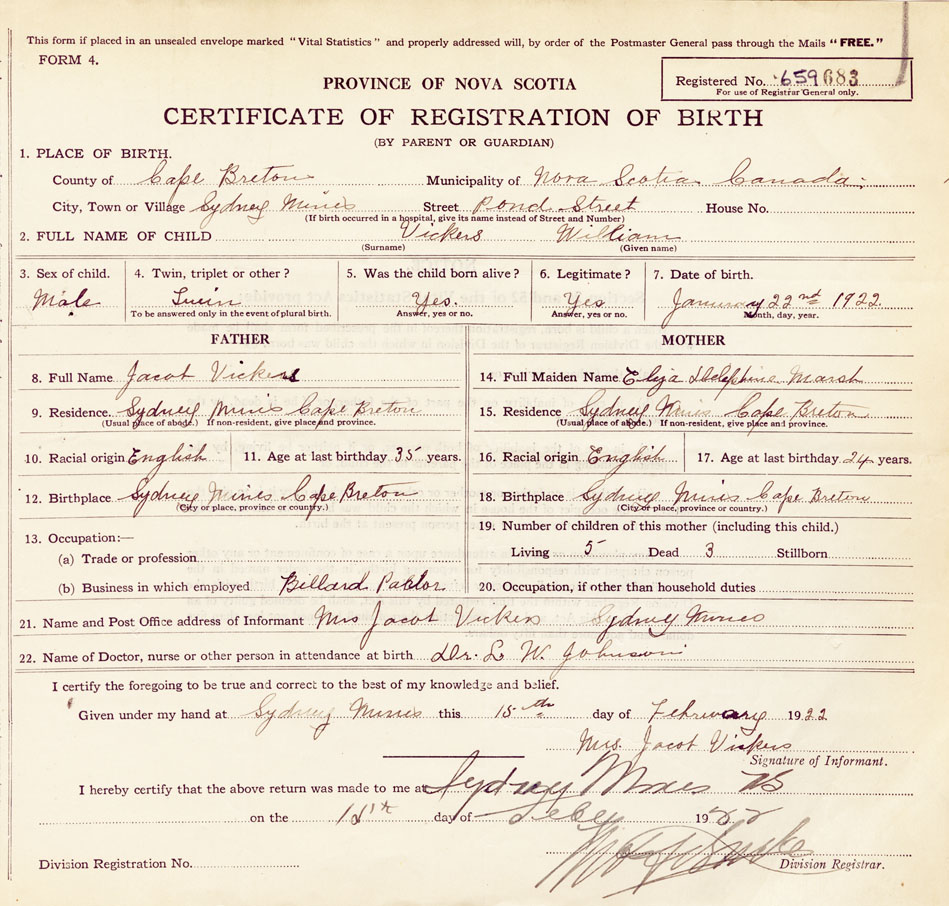 21. Name and Post Office address of Informant Mrs Jacob Vickers, Sydney Mines