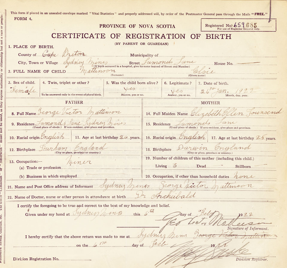 21. Name and Post Office address of Informant George (Geo.) Victor Mattinson, Sydney Mines