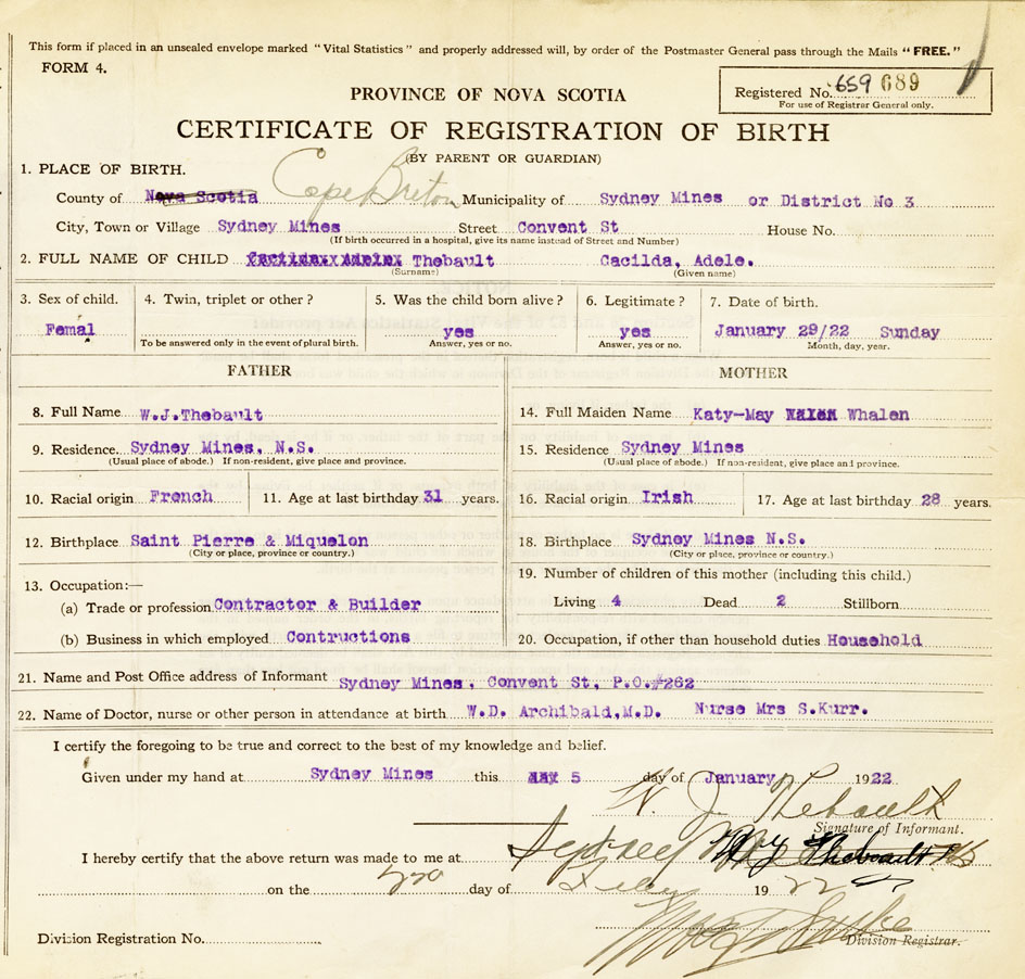 21. Name and Post Office address of Informant W J Thebault, Convent St., PO #262, Sydney Mines