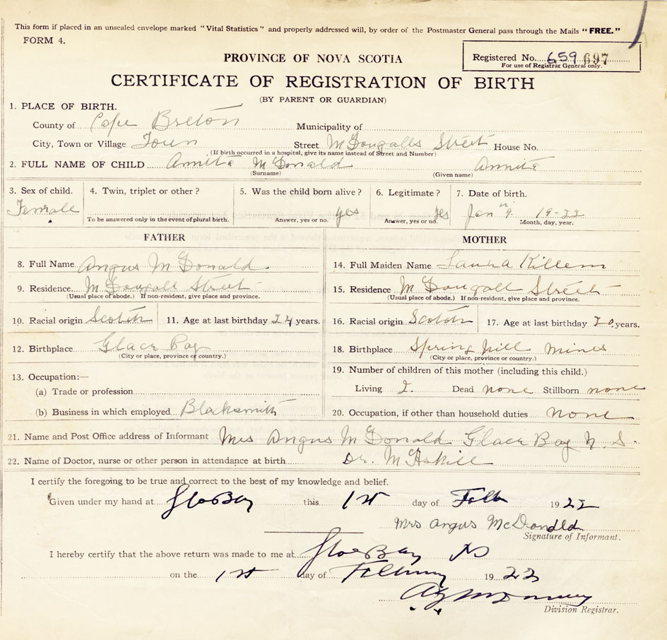 21. Name and Post Office address of Informant Mrs Angus McDonald, Glace Bay