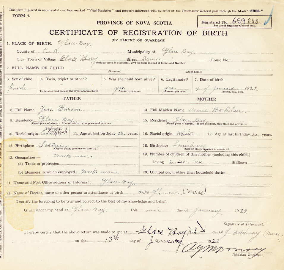 21. Name and Post Office address of Informant Mrs J Detcheverry (Nurse) Glace Bay