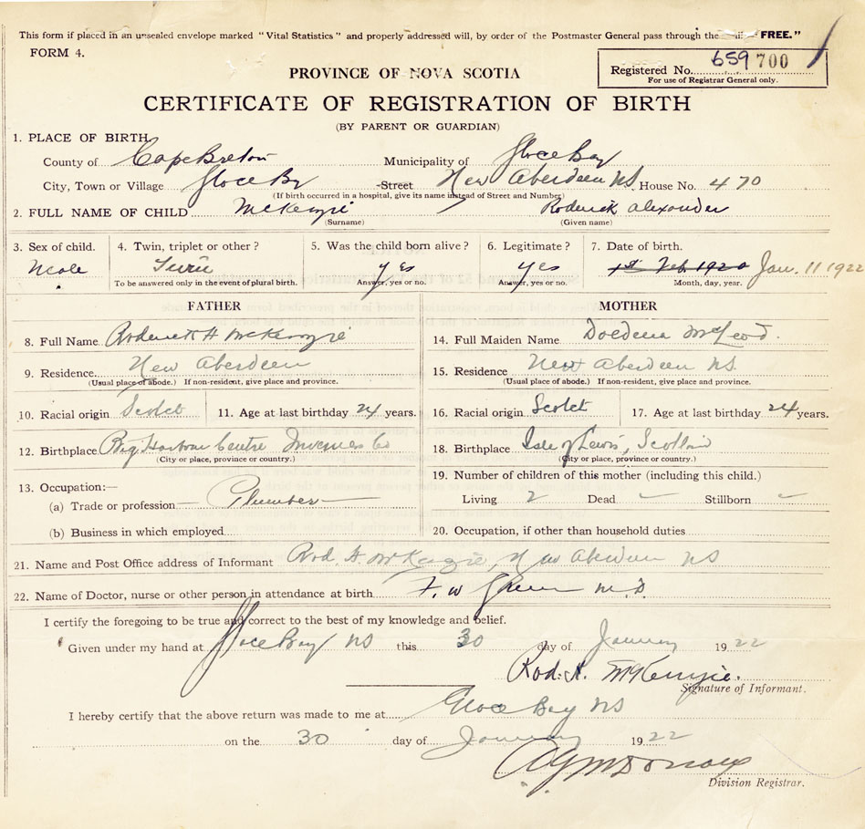 21. Name and Post Office address of Informant Rod'ck McKenzie, New Aberdeen