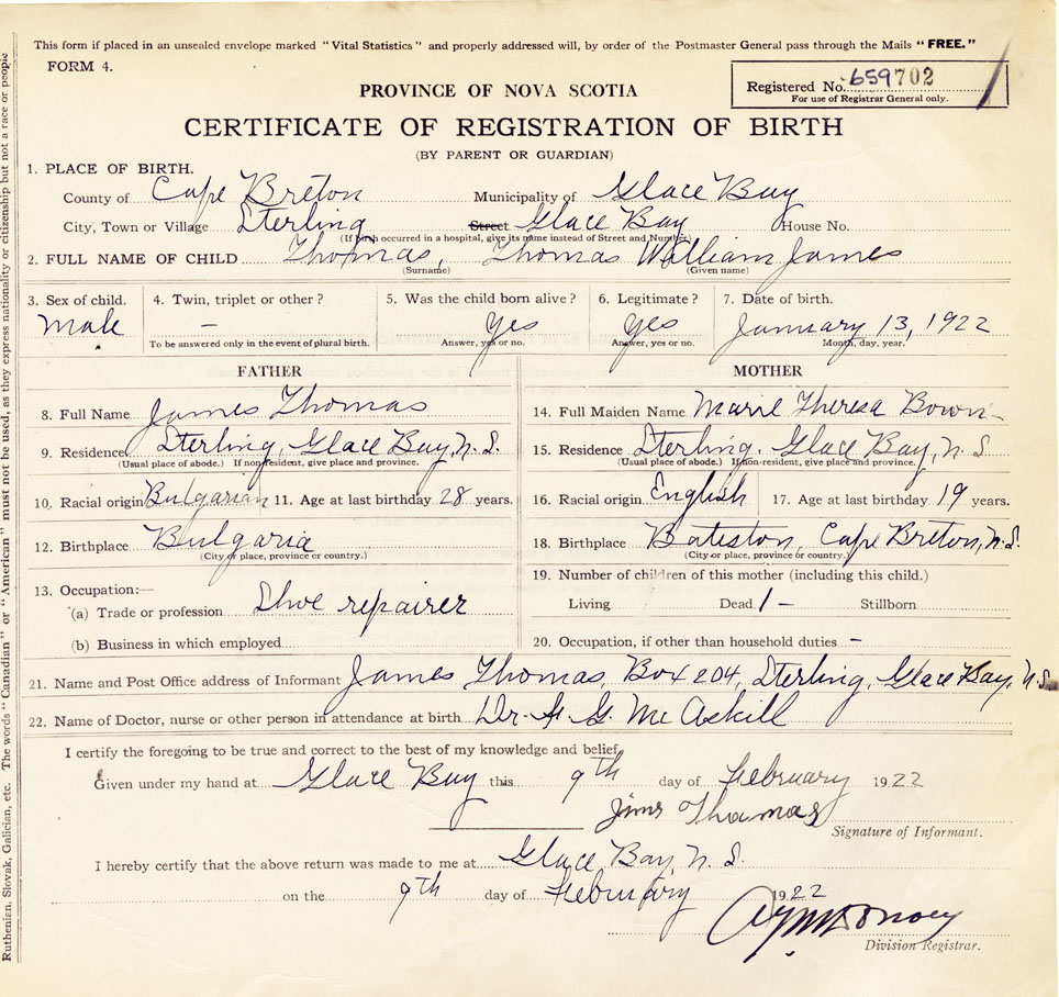 21. Name and Post Office address of Informant James Thomas, Box 204, Sterling Rd., Glace Bay