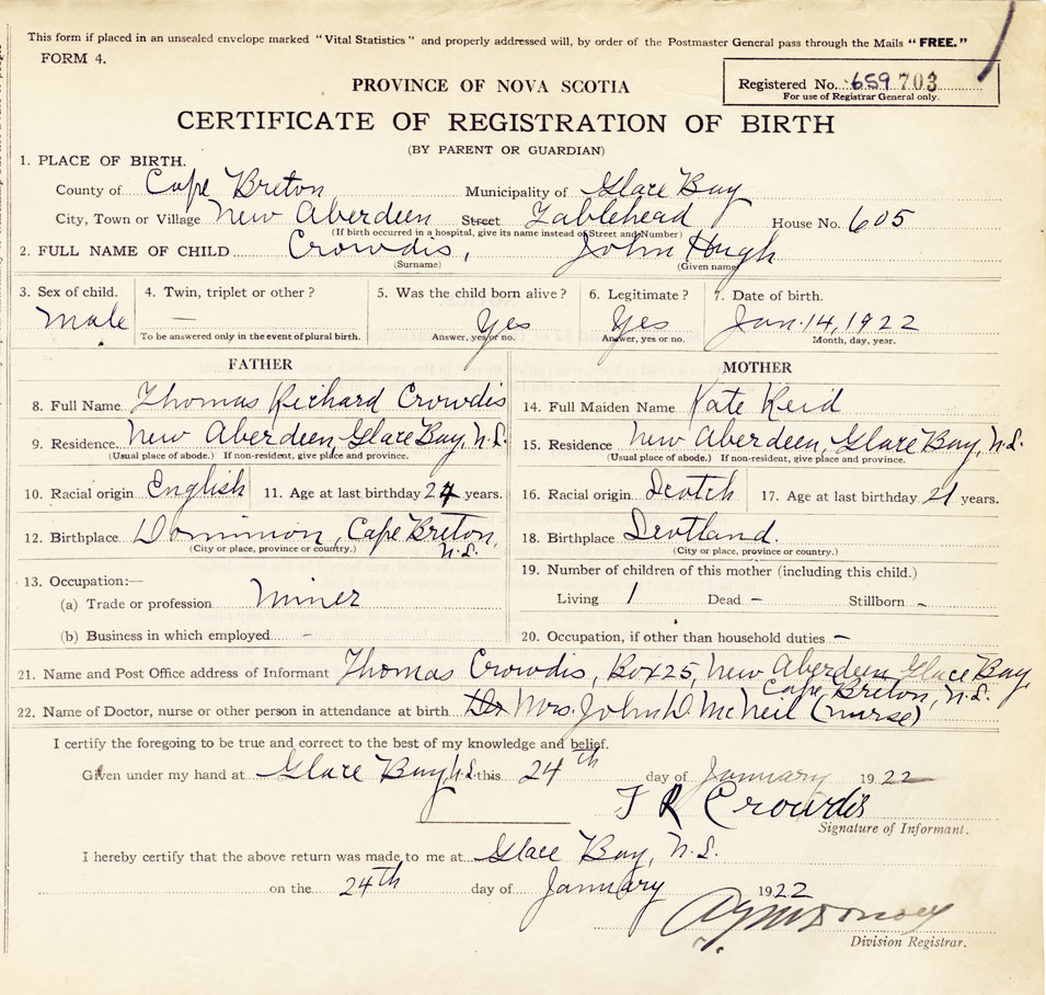 21. Name and Post Office address of Informant Thomas R Crowdis, Box 25, New Aberdeen, Glace Bay, Cape Breton