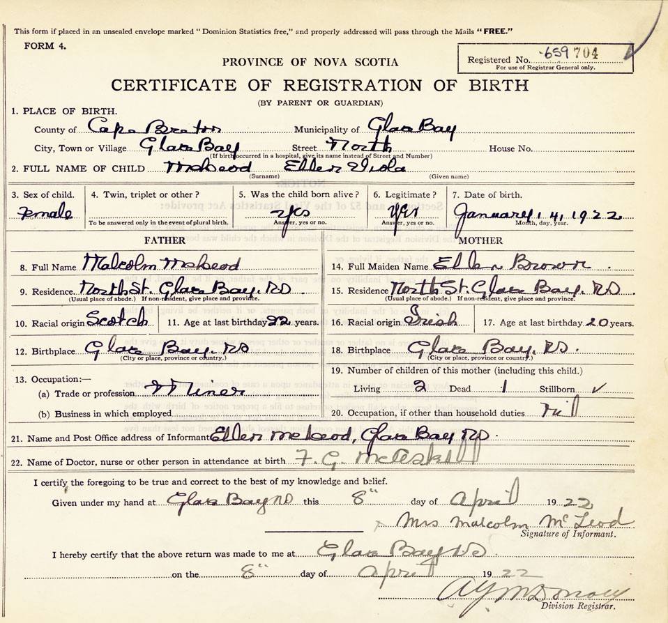 21. Name and Post Office address of Informant Ellen (Mrs Malcolm) McLeod, Glace Bay