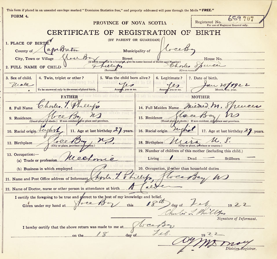 21. Name and Post Office address of Informant Charles T Phillips, Glace Bay