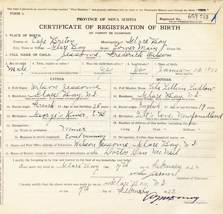 21. Name and Post Office address of Informant Wilson Jessome, Glace Bay
