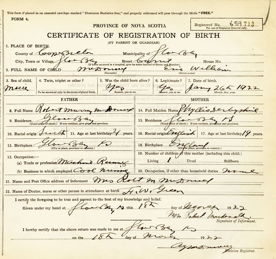 21. Name and Post Office address of Informant Mrs Robert M MacDonald Glace Bay