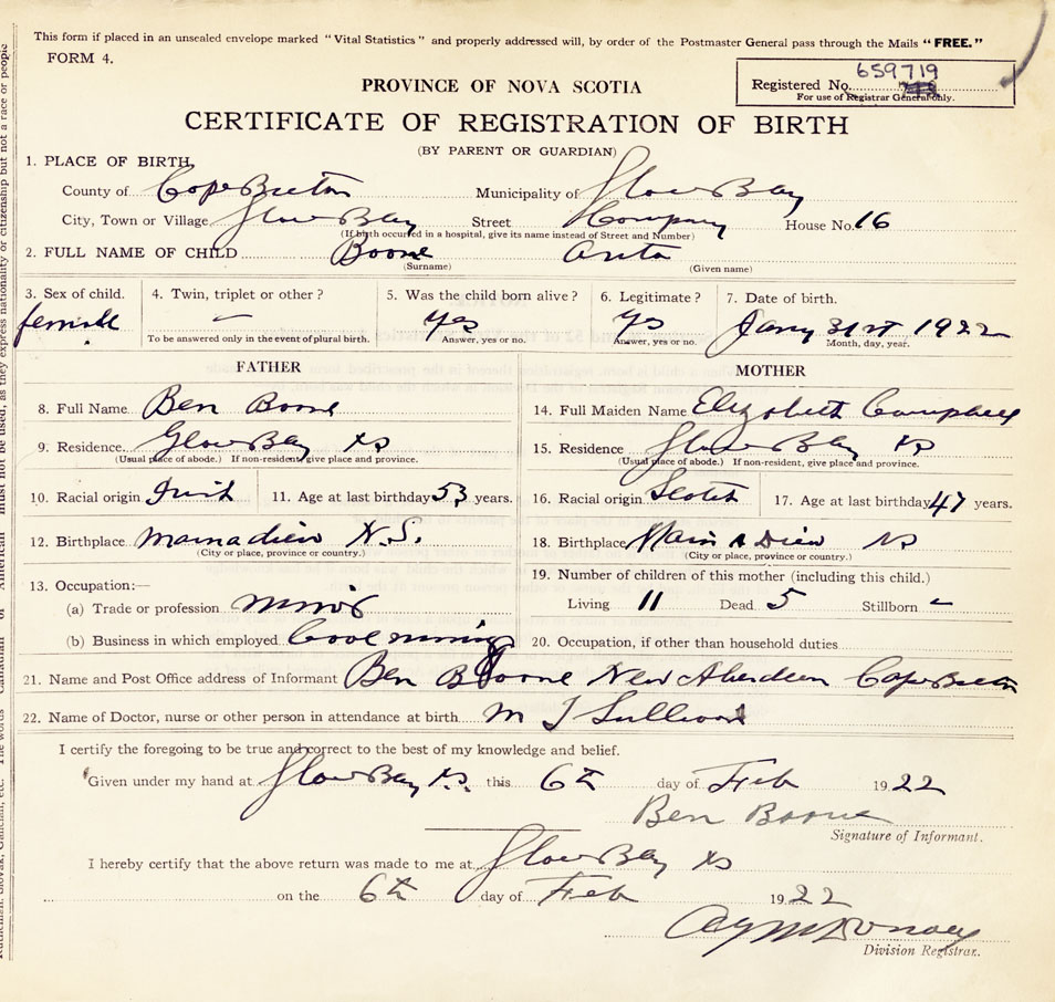 21. Name and Post Office address of Informant Ben Boone New Aberdeen, Cape Breton