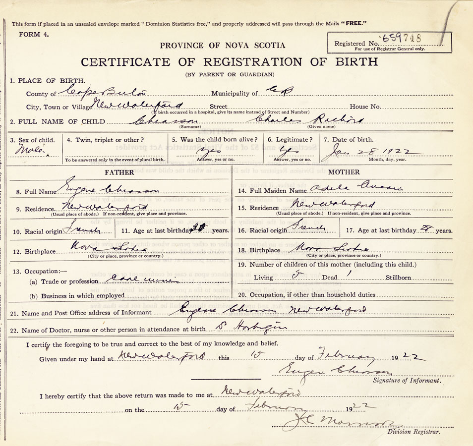 21. Name and Post Office address of Informant Eugene Chiasson, New Waterford