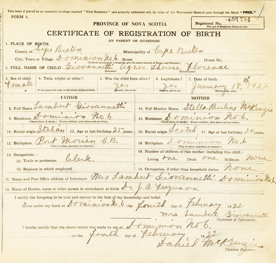 21. Name and Post Office address of Informant Mrs Lambert Giovannetti, Dominion No. 6