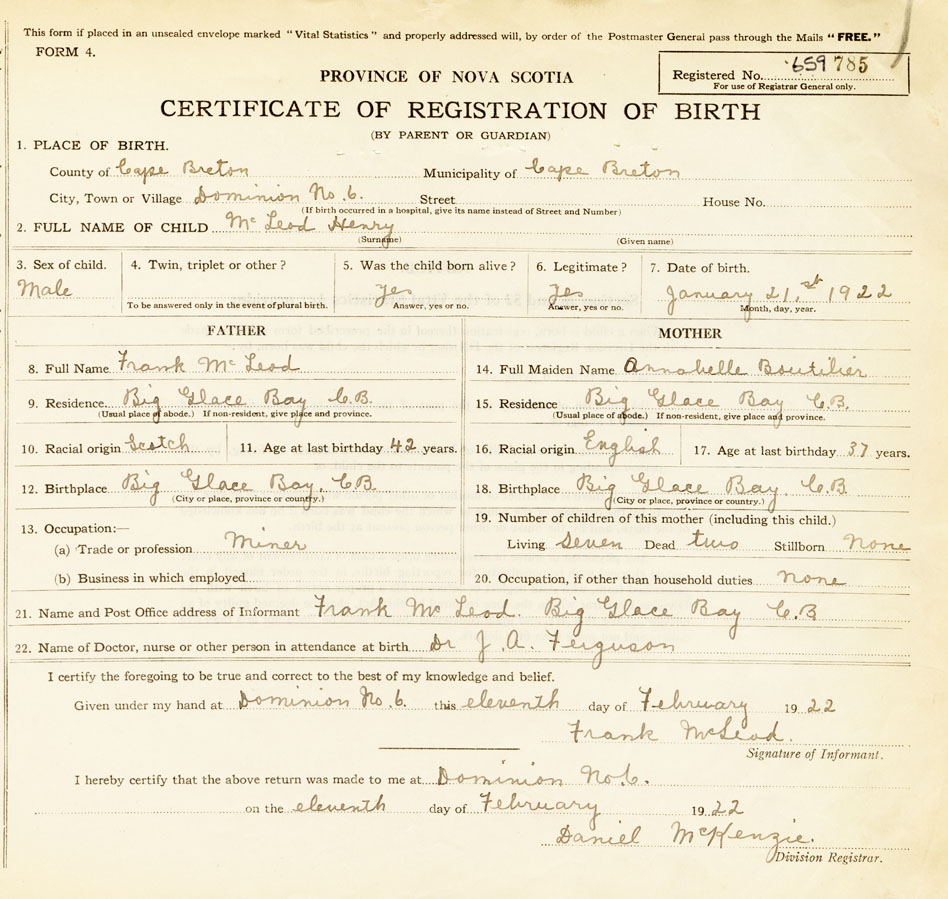 21. Name and Post Office address of Informant Frank McLeod, Big Glace Bay, CB