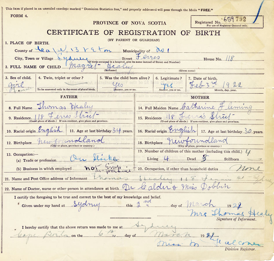 21. Name and Post Office address of Informant Mrs Thomas Healey, 118 Ferris St., Sydney