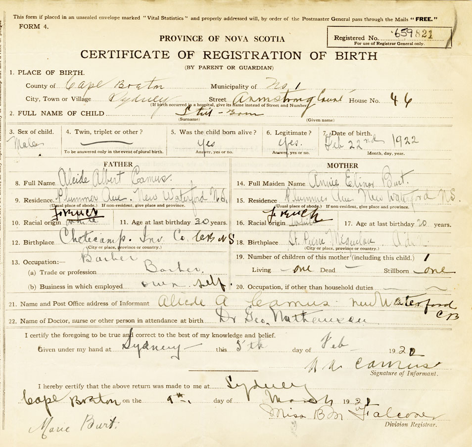 21. Name and Post Office address of Informant Aleide A Camus New Waterford C. B.
