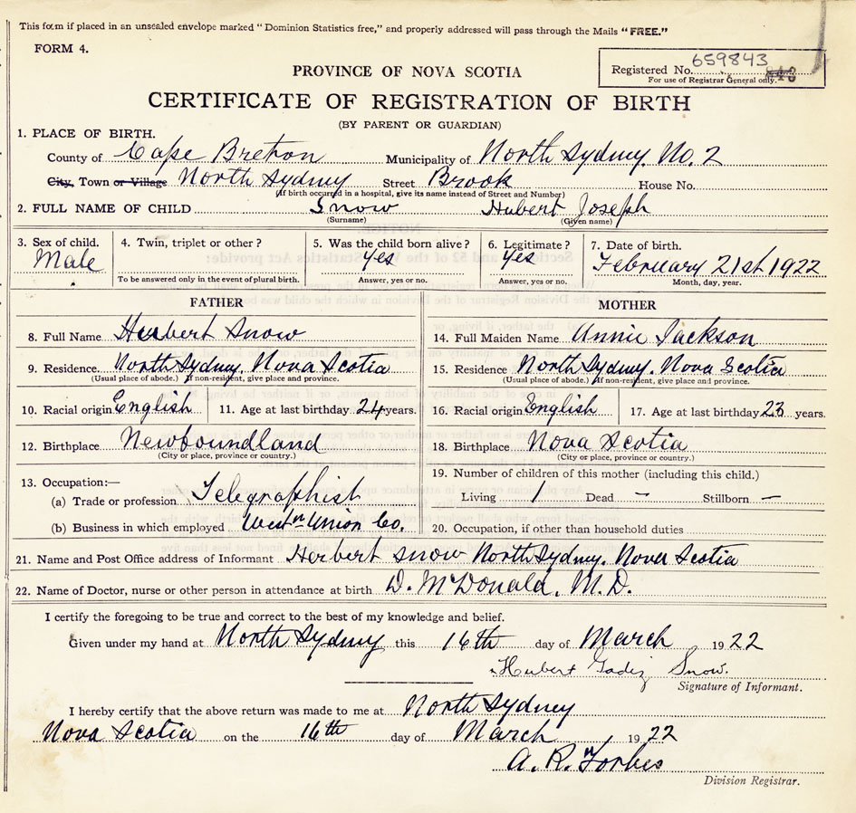 21. Name and Post Office address of Informant Herbert Snow North Sydney