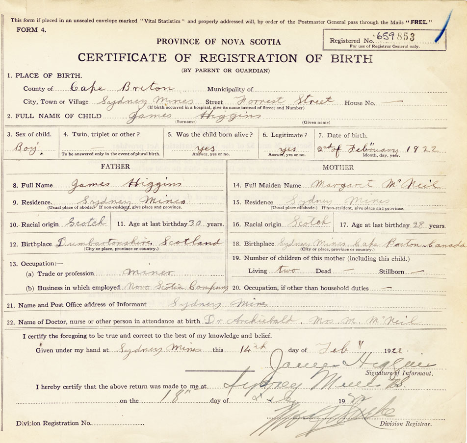 21. Name and Post Office address of Informant James Higgins, Sydney Mines