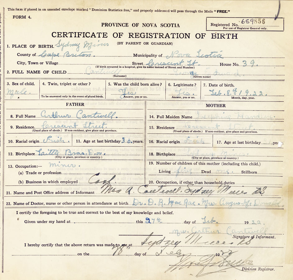 21. Name and Post Office address of Informant Mrs. A. Cantwell Sydney Mines
