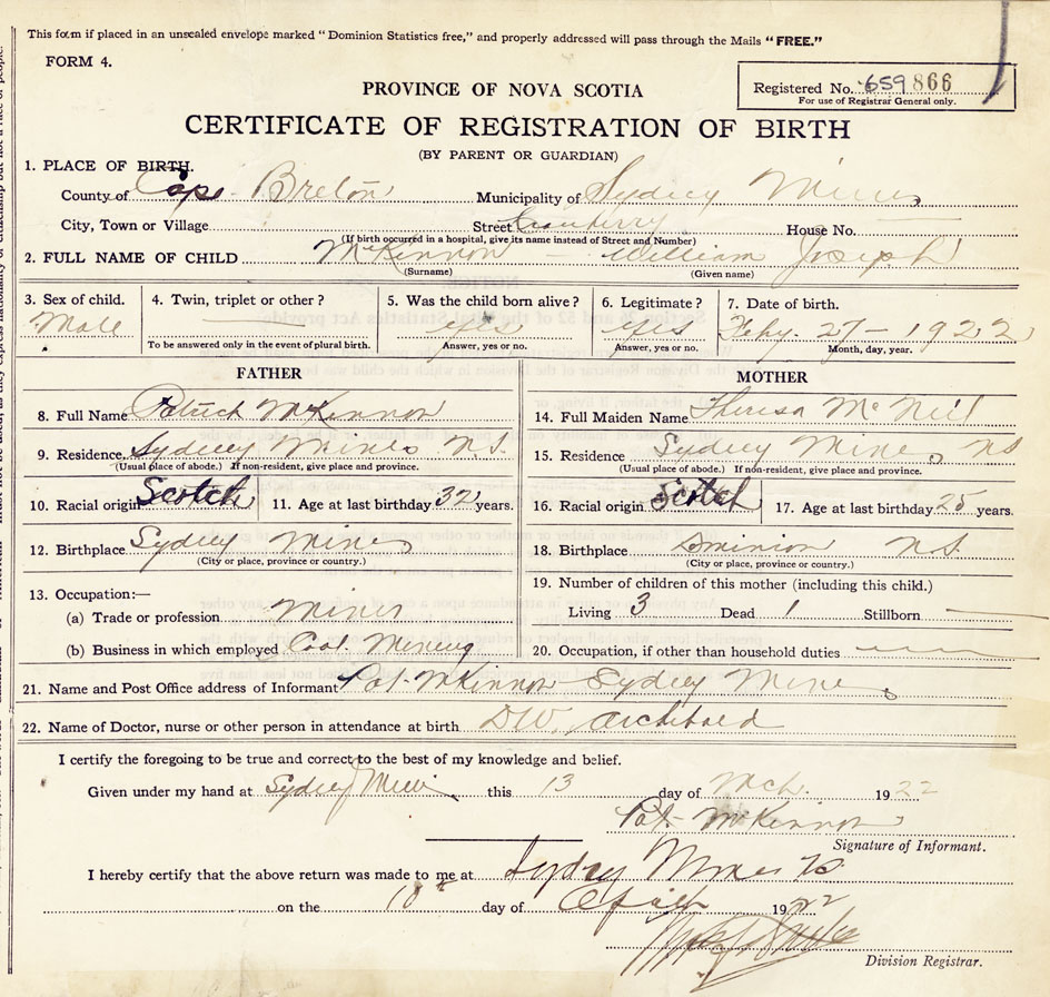 21. Name and Post Office address of Informant Pat McKinnon, Sydney Mines