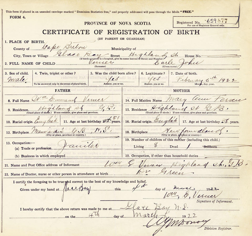 21. Name and Post Office address of Informant Wm. E Verner, Highland St., Glace Bay