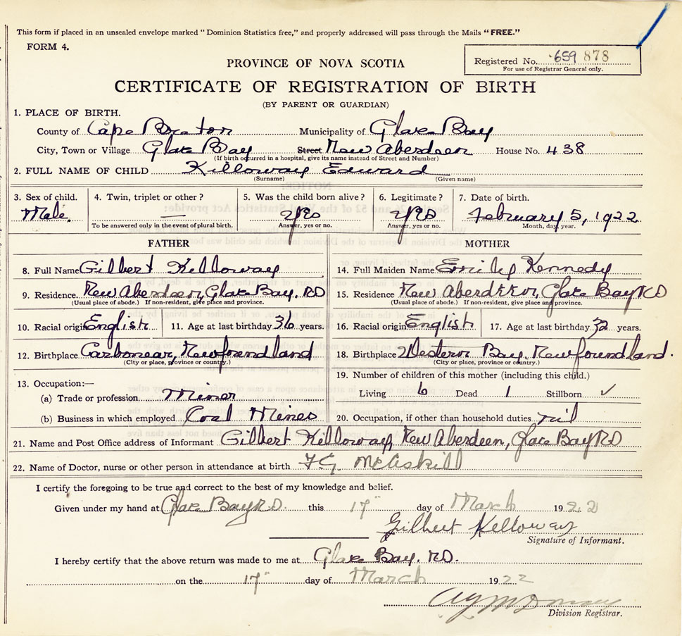 21. Name and Post Office address of Informant Gilbert Kelloway, New Aberdeen, Glace Bay