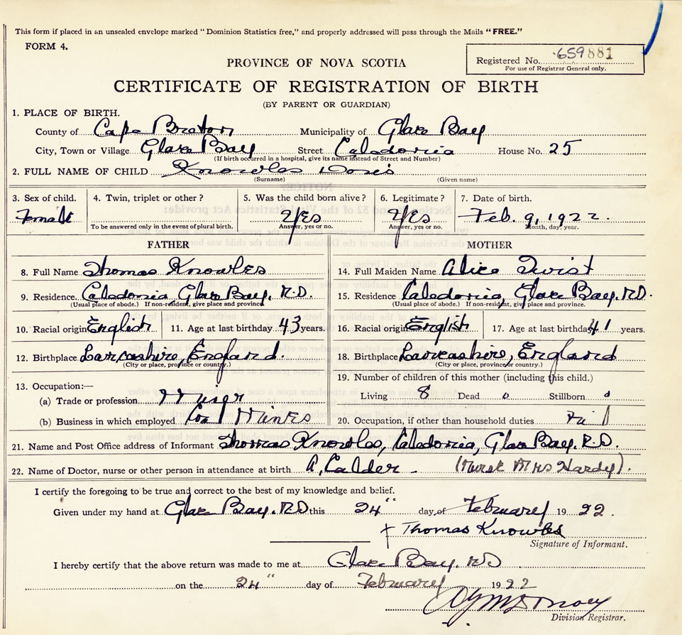 21. Name and Post Office address of Informant Thomas Knowles Caledonia, Glace Bay
