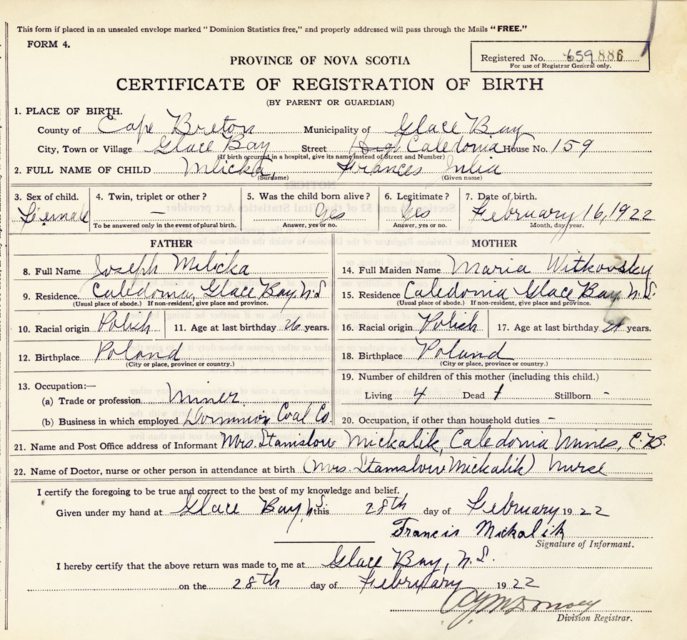 21. Name and Post Office address of Informant Mrs. Stamishous Mickalik Caledonia Mines, C.B.
