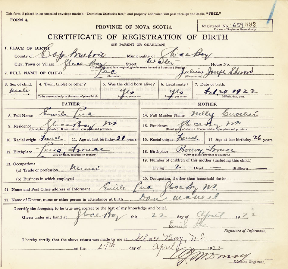 21. Name and Post Office address of Informant Emile Luc Glace Bay