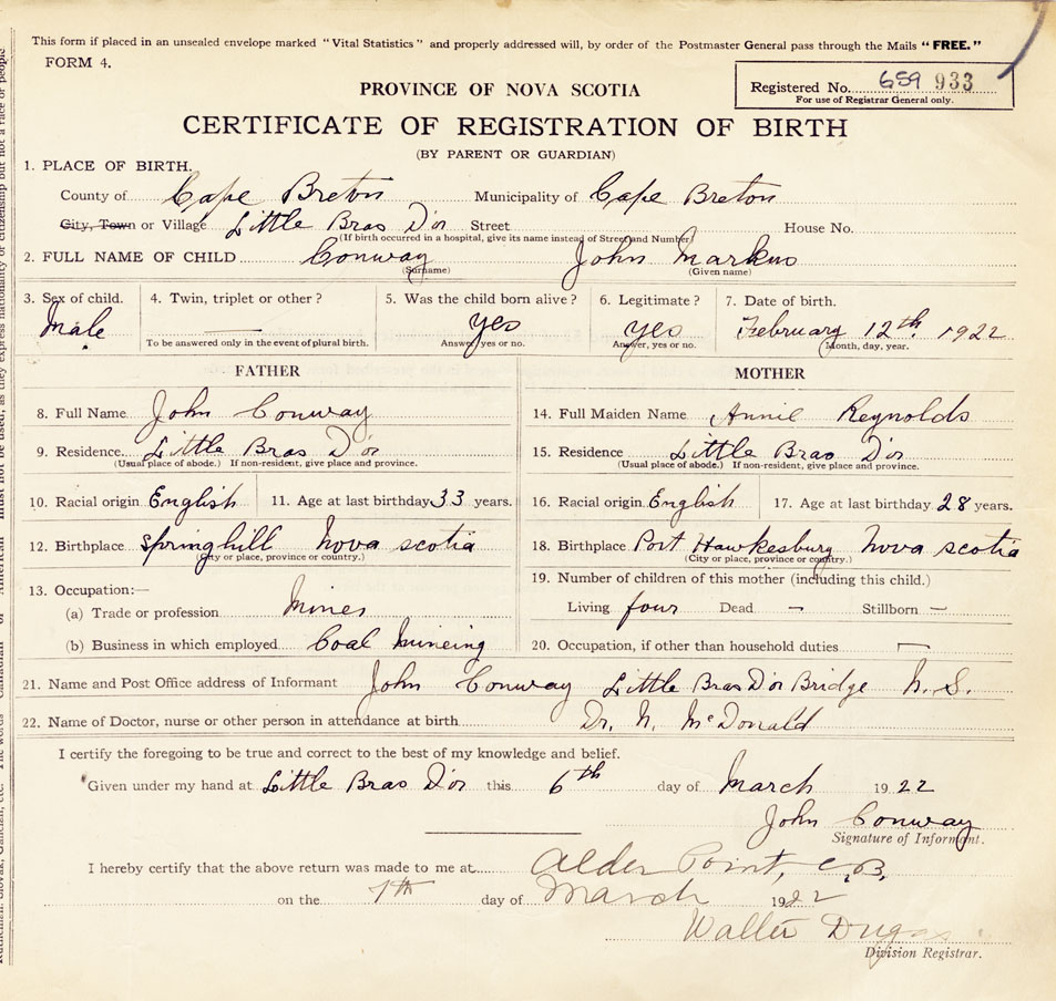 21. Name and Post Office address of Informant John Conway Little Bras D'Or Bridge